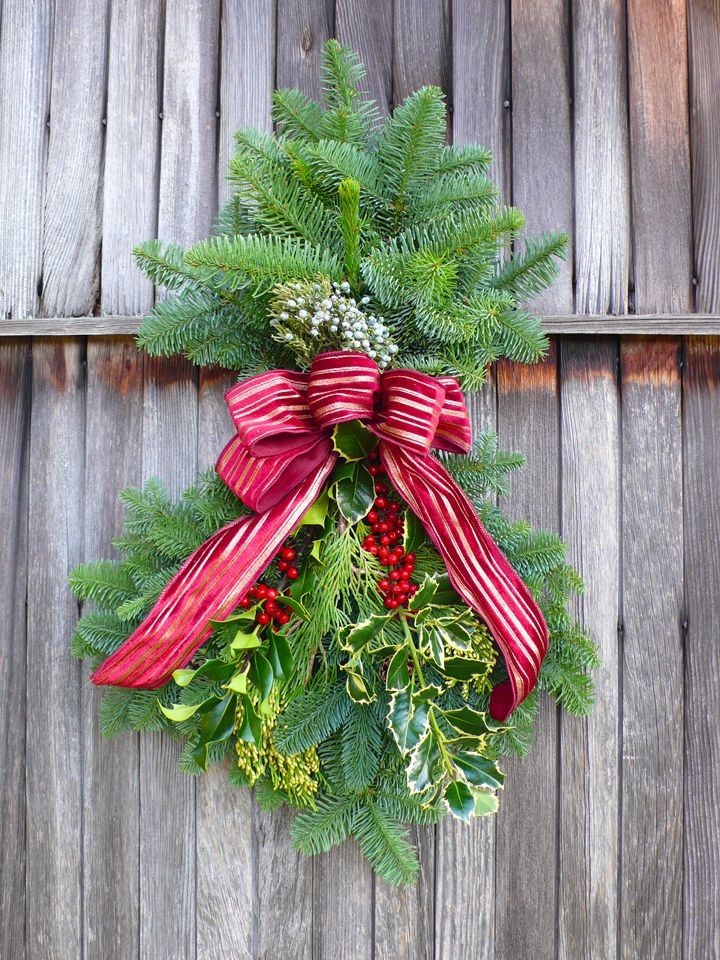 Each two-foot long door charm is crafted with Noble and Douglas fir, cedar, juniper, English and variegated holly, ponderosa pine cones and completed with a plush fabric handmade bow. The fir base is clamped into a sturdy wire holder with a convenient built-in hook on the back.