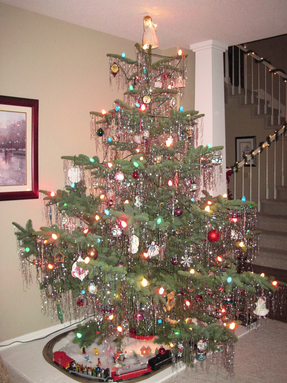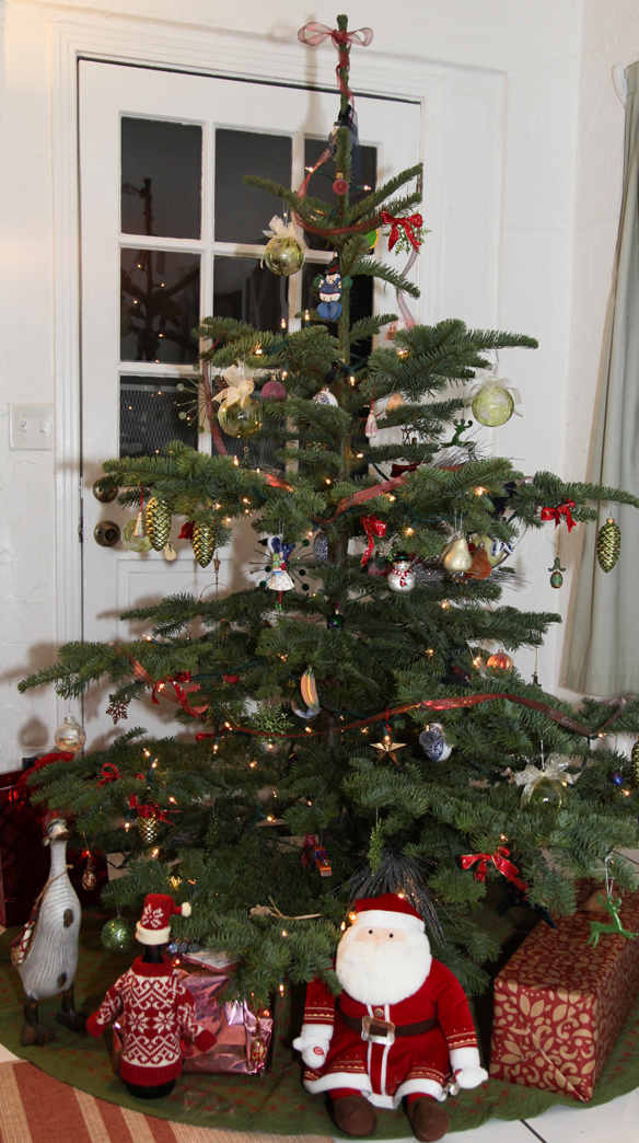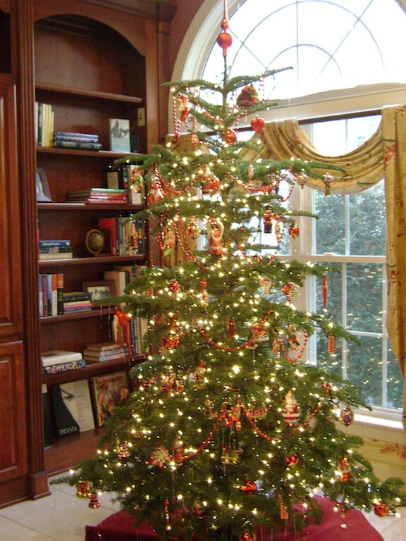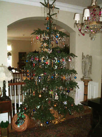 Precious ornaments of the past give a traditional lookJustin, a new customer, ordered a medium density noble and the tip got bent in transit. Even though nobles are workhorses as far as ruggedness goes, Justin had a bright idea for getting his tree to behave by sticking a rod in to keep the tree top straight. I asked if we might showcase his tree for your viewing pleasure.