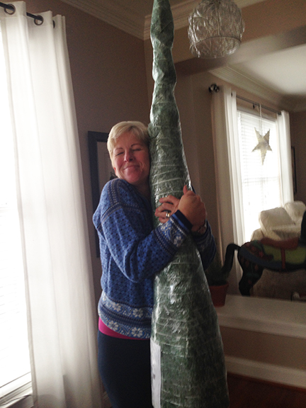 I challenge myself every year to see how close I can get the star to the ceiling. We were right on the money this year.I think you could barely pass a sheet of paper between the ceiling and the star. And we might have gone a little overboard with ornaments this year....but... here it is...WOW, you created a masterpiece here! CHECK OUT how Justin watered this doweled tree - ingenious, yet simple!